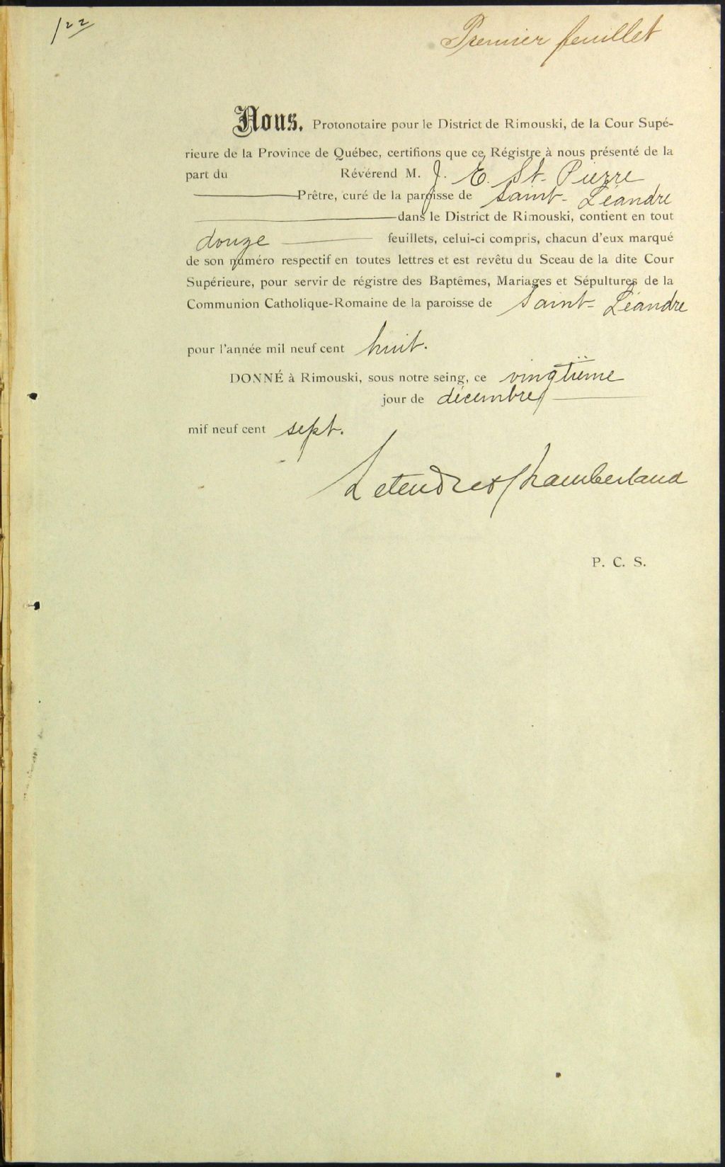 Saint-Léandre, 1906-1921, Archives nationales à Rimouski, Fonds Cour supérieure. District judiciaire de Rimouski. État civil, (01R,CE101,S37).