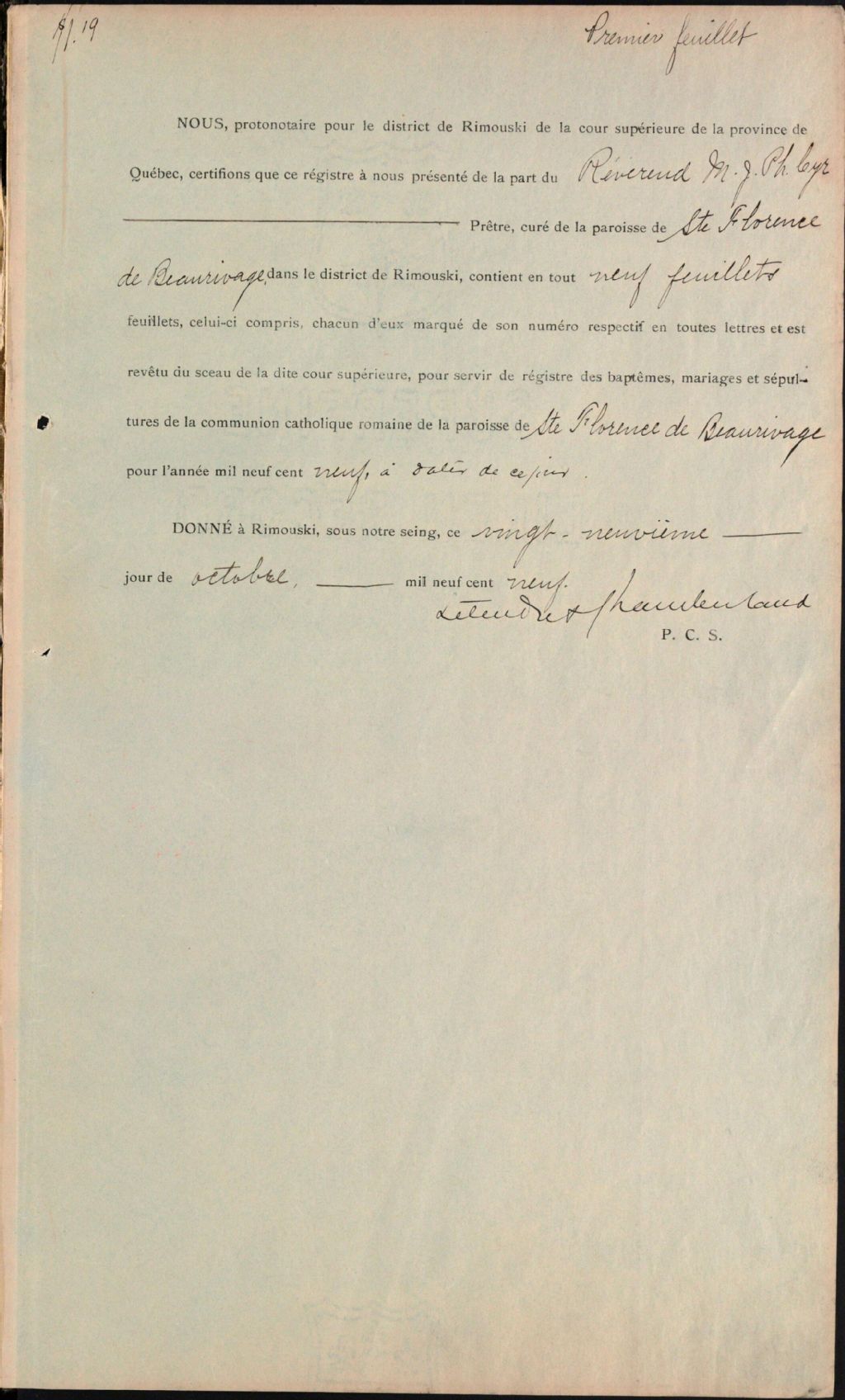 Sainte-Florence de Beaurivage, 1909-1921, Archives nationales à Rimouski, Fonds Cour supérieure. District judiciaire de Rimouski. État civil, (01R,CE101,S39).