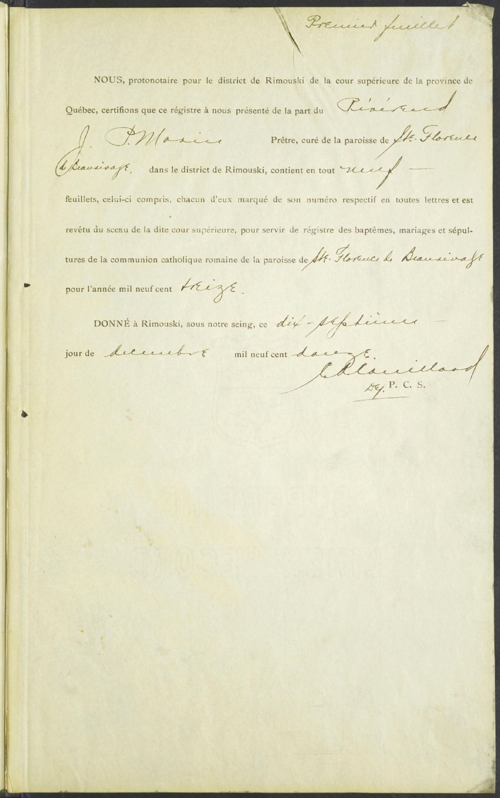 Sainte-Florence de Beaurivage, 1909-1921, Archives nationales à Rimouski, Fonds Cour supérieure. District judiciaire de Rimouski. État civil, (01R,CE101,S39).