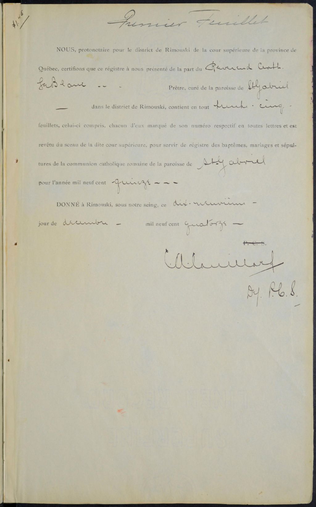 Saint-Gabriel, 1873-1921, Archives nationales à Rimouski, Fonds Cour supérieure. District judiciaire de Rimouski. État civil, (01R,CE101,S5).