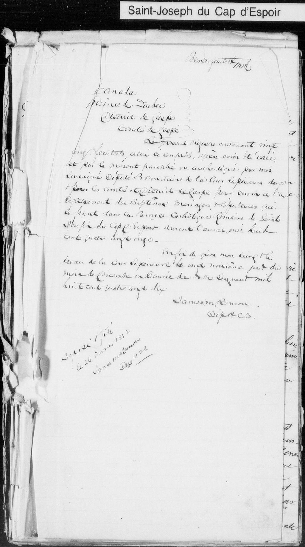 Saint-Joseph-de-Cap-d'Espoir, 1867-1921, Archives nationales à Rimouski, Fonds Cour supérieure. District judiciaire de Gaspé. État civil, (01R,CE102,S15).