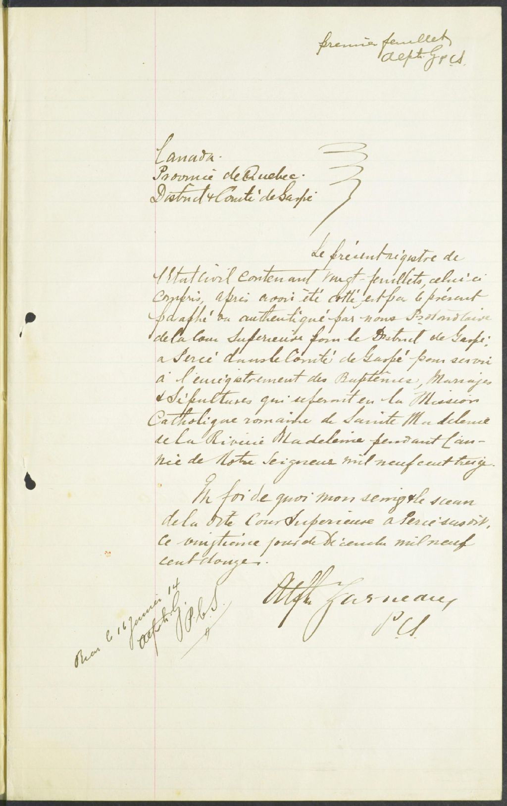Sainte-Madeleine-de-Rivière-Madeleine, 1874-1921, Archives nationales à Rimouski, Fonds Cour supérieure. District judiciaire de Gaspé. État civil, (01R,CE102,S17).
