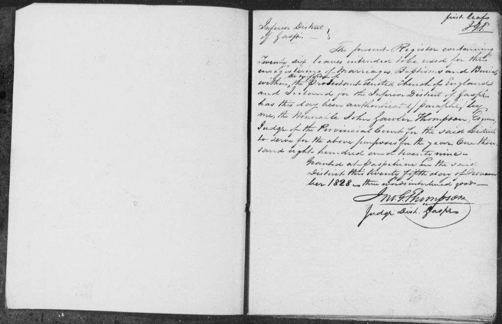 Protestant Episcopal of St-Paul & St-James of Gaspe Bassin, 1829-1906; 1908-1921, Archives nationales à Rimouski, Fonds Cour supérieure. District judiciaire de Gaspé. État civil, (01R,CE102,S37).