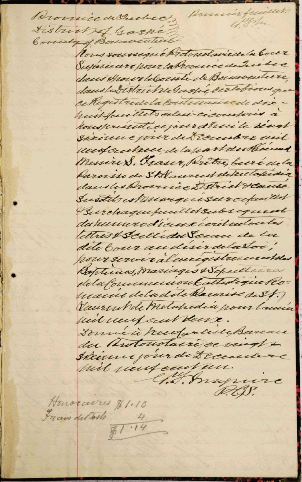 Saint-Laurent-de-Matapédia, 1888-1921, Archives nationales à Rimouski, Fonds Cour supérieure. District judiciaire de Bonaventure. État civil, (01R,CE103,S11).