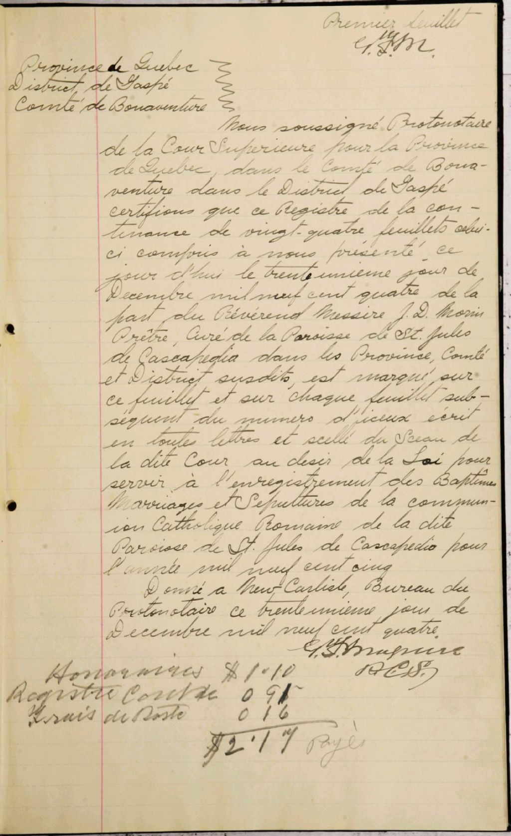 Saint-Jules, 1901-1921, Archives nationales à Rimouski, Fonds Cour supérieure. District judiciaire de Bonaventure. État civil, (01R,CE103,S23).