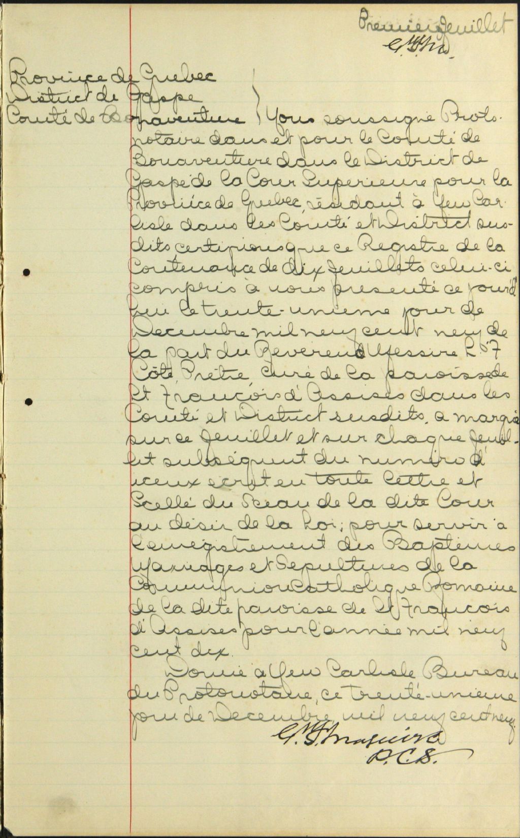 Saint-François-d'Assise, 1904-1921, Archives nationales à Rimouski, Fonds Cour supérieure. District judiciaire de Bonaventure. État civil, (01R,CE103,S25).