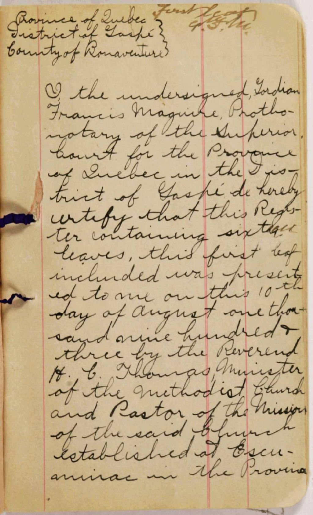 Escuminac Methodist Church, 1903-1909, Archives nationales à Rimouski, Fonds Cour supérieure. District judiciaire de Bonaventure. État civil, (01R,CE103,S28).