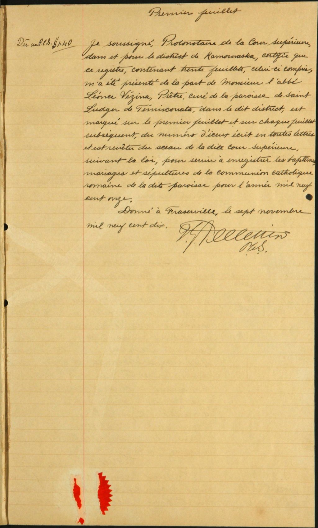 Saint-Ludger, 1906-1921, Archives nationales à Rimouski, Fonds Cour supérieure. District judiciaire de Kamouraska. État civil, (01R,CE104,S43).