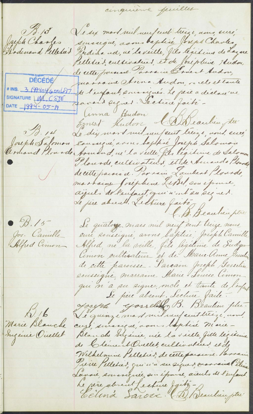 Saint-Hubert, 1886-1921, Archives nationales à Rimouski, Fonds Cour supérieure. District judiciaire de Kamouraska. État civil, (01R,CE104,S5).