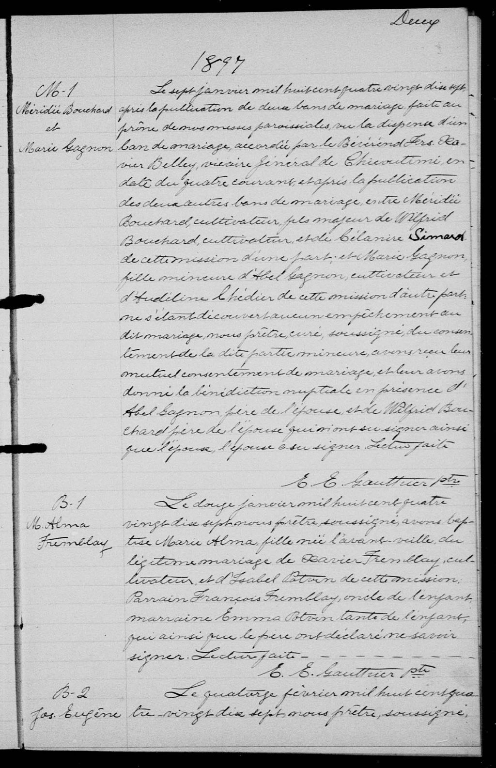 - Cette série regroupe les registres originaux de l'état civil, lesquels contiennent les enregistrements de baptêmes, de mariages et de sépultures consignés par le curé ou son représentant au cours de la période concernée par les documentsOutre les renseignements à caractère généalogique que nous pouvons y puiser, cette série peut constituer une source documentaire importante pour toute étude-statistique ou comparative sur les conditions de vie à différentes époques (mortalité infantile, espérance de vie) ou pour toute recherche portant sur l'occupation des terres (lieu de résidence), sur le mode vie (métiers et professions, statut et âge des époux), sur les classes sociales (titres des parties impliquées, témoins/amis/parents présents lors du mariage), sur des événements spéciaux (quelques mentions dans les sépultures) et sur des sujets à incidence médicale tels les maladies héréditaires (cause du décès)