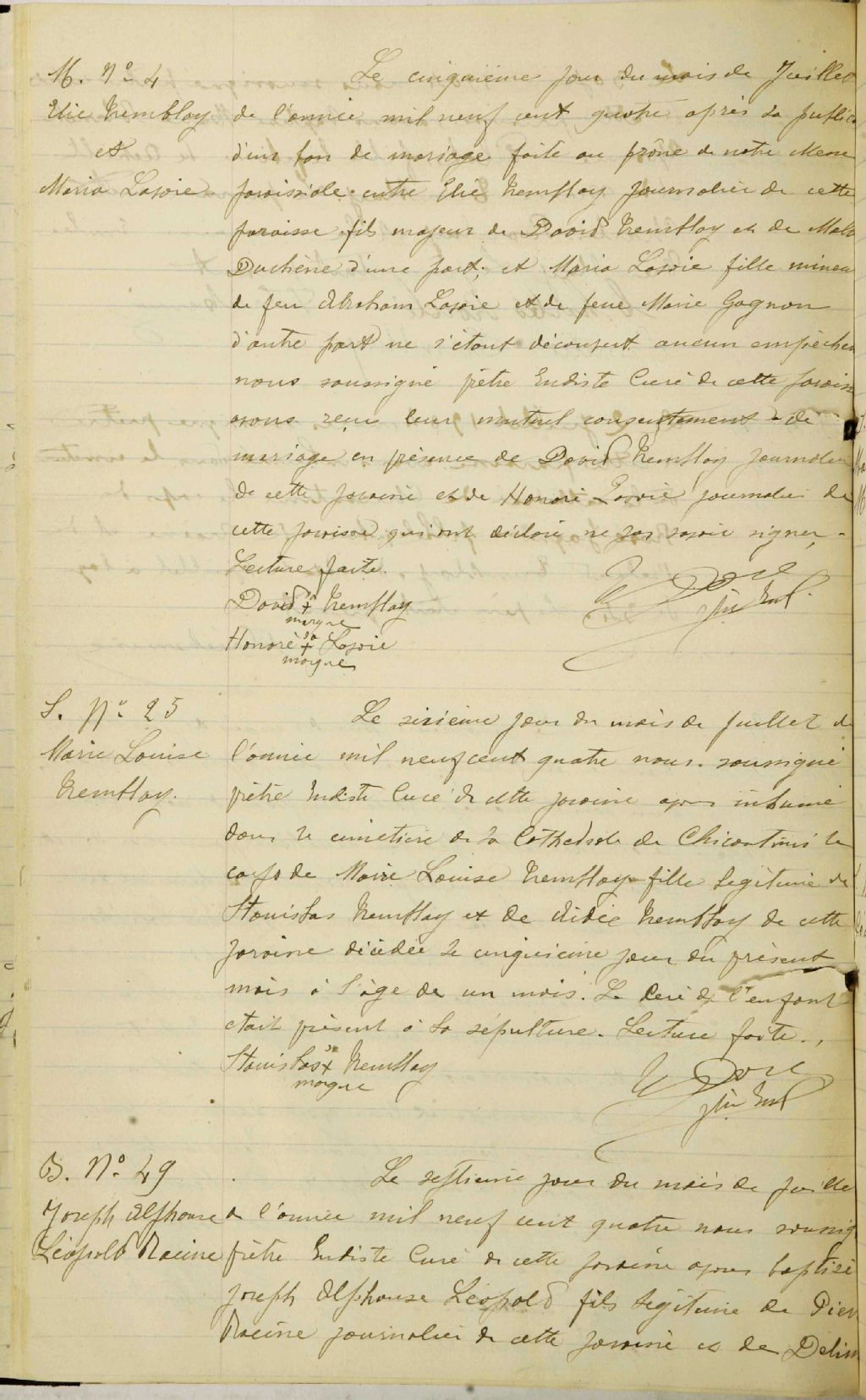 - Cette série regroupe les registres originaux de l'état civil, lesquels contiennent les enregistrements de baptêmes, de mariages et de sépultures consignés par le curé ou son représentant au cours de la période concernée par les documentsOutre les renseignements à caractère généalogique que nous pouvons y puiser, cette série peut constituer une source documentaire importante pour toute étude-statistique ou comparative sur les conditions de vie à différentes époques (mortalité infantile, espérance de vie) ou pour toute recherche portant sur l'occupation des terres (lieu de résidence), sur le mode vie (métiers et professions, statut et âge des époux), sur les classes sociales (titres des parties impliquées, témoins/amis/parents présents lors du mariage), sur des événements spéciaux (quelques mentions dans les sépultures) et sur des sujets à incidence médicale tels les maladies héréditaires (cause du décès)