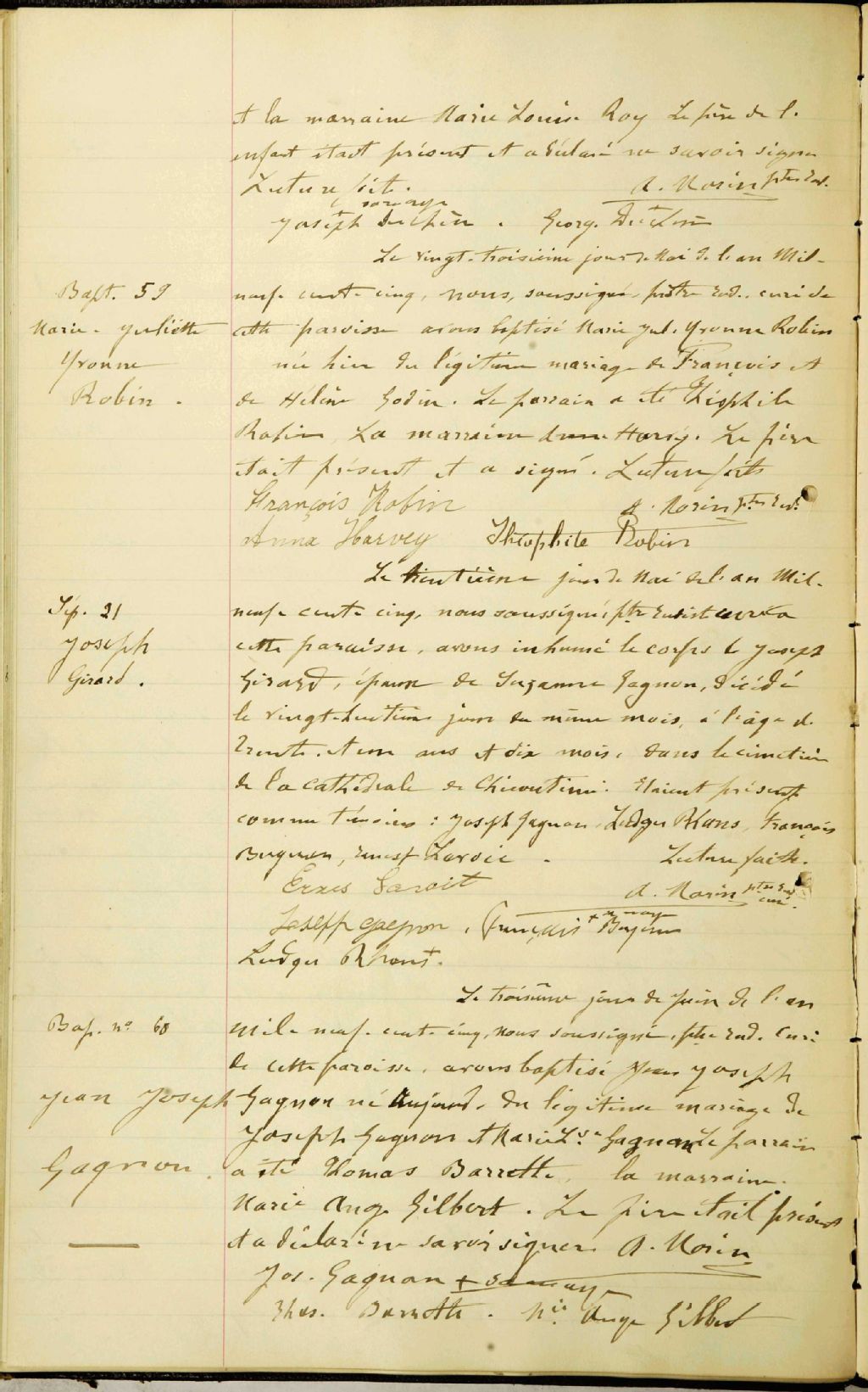 - Cette série regroupe les registres originaux de l'état civil, lesquels contiennent les enregistrements de baptêmes, de mariages et de sépultures consignés par le curé ou son représentant au cours de la période concernée par les documentsOutre les renseignements à caractère généalogique que nous pouvons y puiser, cette série peut constituer une source documentaire importante pour toute étude-statistique ou comparative sur les conditions de vie à différentes époques (mortalité infantile, espérance de vie) ou pour toute recherche portant sur l'occupation des terres (lieu de résidence), sur le mode vie (métiers et professions, statut et âge des époux), sur les classes sociales (titres des parties impliquées, témoins/amis/parents présents lors du mariage), sur des événements spéciaux (quelques mentions dans les sépultures) et sur des sujets à incidence médicale tels les maladies héréditaires (cause du décès)