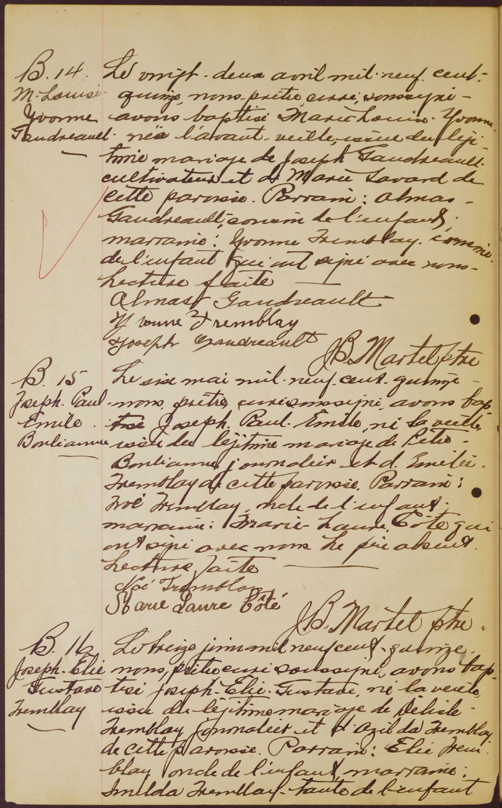 Cette série regroupe les registres originaux de l'état civil, lesquels contiennent les enregistrements de baptêmes, de mariages et de sépultures consignés par le curé ou son représentant au cours de la période concernée par les documents.Outre les renseignements à caractère généalogique que nous pouvons y puiser, cette série peut constituer une source documentaire importante pour toute étude-statistique ou comparative sur les conditions de vie à différentes époques (mortalité infantile, espérance de vie) ou pour toute recherche portant sur l'occupation des terres (lieu de résidence), sur le mode vie (métiers et professions, statut et âge des époux), sur les classes sociales (titres des parties impliquées, témoins/amis/parents présents lors du mariage), sur des événements spéciaux (quelques mentions dans les sépultures) et sur des sujets à incidence médicale tels les maladies héréditaires (cause du décès)