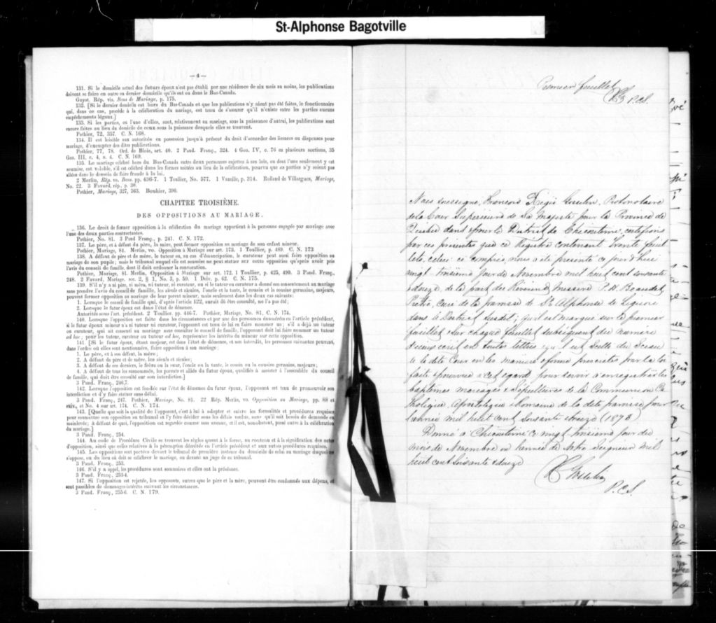 - Cette série regroupe les registres originaux de l'état civil, lesquels contiennent les enregistrements de baptêmes, de mariages et de sépultures consignés par le curé ou son représentant au cours de la période concernée par les documents. Pour la période 1858 à 1876 nous disposons également d'une copie sur bobines de microfilm, des registres conservés dans les paroisses.Outre les renseignements à caractère généalogique que nous pouvons y puiser, cette série peut constituer une source documentaire importante pour toute étude-statistique ou comparative sur les conditions de vie à différentes époques (mortalité infantile, espérance de vie) ou pour toute recherche portant sur l'occupation des terres (lieu de résidence), sur le mode vie (métiers et professions, statut et âge des époux), sur les classes sociales (titres des parties impliquées, témoins/amis/parents présents lors du mariage), sur des événements spéciaux (quelques mentions dans les sépultures) et sur des sujets à incidence médicale tels les maladies héréditaires (cause du décès)