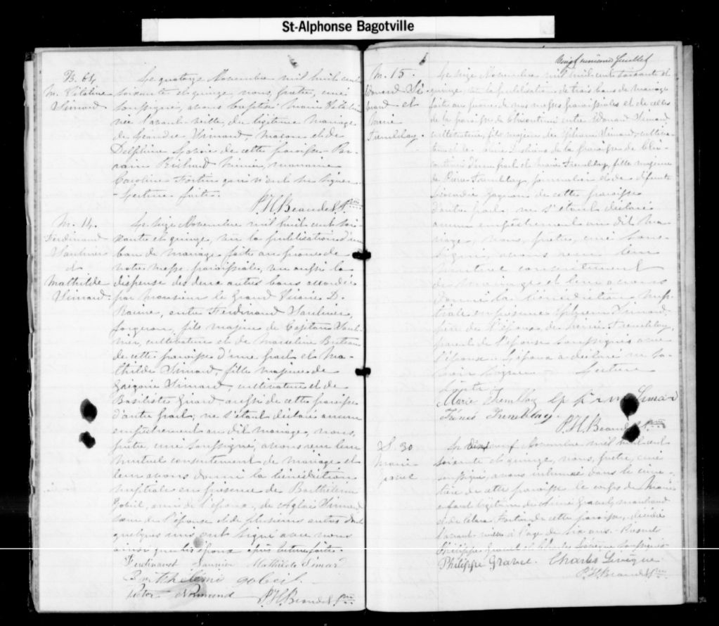 - Cette série regroupe les registres originaux de l'état civil, lesquels contiennent les enregistrements de baptêmes, de mariages et de sépultures consignés par le curé ou son représentant au cours de la période concernée par les documents. Pour la période 1858 à 1876 nous disposons également d'une copie sur bobines de microfilm, des registres conservés dans les paroisses.Outre les renseignements à caractère généalogique que nous pouvons y puiser, cette série peut constituer une source documentaire importante pour toute étude-statistique ou comparative sur les conditions de vie à différentes époques (mortalité infantile, espérance de vie) ou pour toute recherche portant sur l'occupation des terres (lieu de résidence), sur le mode vie (métiers et professions, statut et âge des époux), sur les classes sociales (titres des parties impliquées, témoins/amis/parents présents lors du mariage), sur des événements spéciaux (quelques mentions dans les sépultures) et sur des sujets à incidence médicale tels les maladies héréditaires (cause du décès)