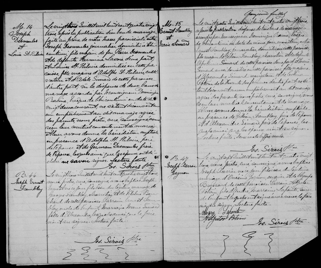 - Cette série regroupe les registres originaux de l'état civil, lesquels contiennent les enregistrements de baptêmes, de mariages et de sépultures consignés par le curé ou son représentant au cours de la période concernée par les documents. Pour la période 1858 à 1876 nous disposons également d'une copie sur bobines de microfilm, des registres conservés dans les paroisses.Outre les renseignements à caractère généalogique que nous pouvons y puiser, cette série peut constituer une source documentaire importante pour toute étude-statistique ou comparative sur les conditions de vie à différentes époques (mortalité infantile, espérance de vie) ou pour toute recherche portant sur l'occupation des terres (lieu de résidence), sur le mode vie (métiers et professions, statut et âge des époux), sur les classes sociales (titres des parties impliquées, témoins/amis/parents présents lors du mariage), sur des événements spéciaux (quelques mentions dans les sépultures) et sur des sujets à incidence médicale tels les maladies héréditaires (cause du décès)