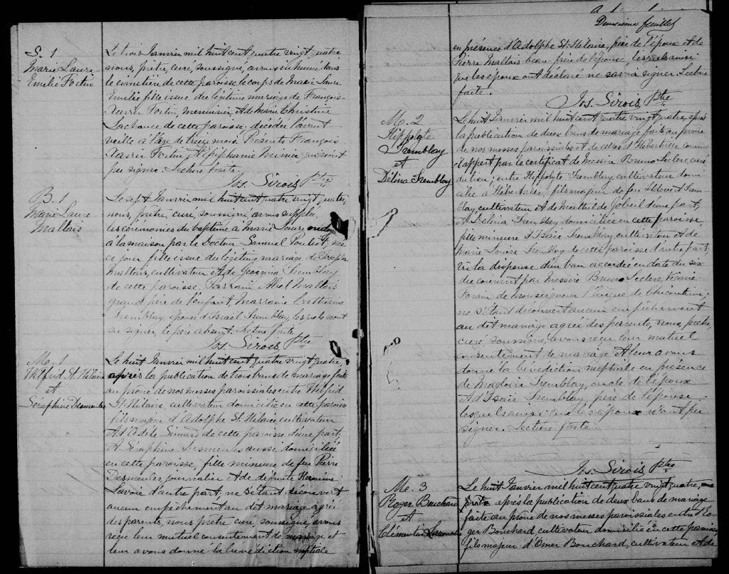 - Cette série regroupe les registres originaux de l'état civil, lesquels contiennent les enregistrements de baptêmes, de mariages et de sépultures consignés par le curé ou son représentant au cours de la période concernée par les documents. Pour la période 1858 à 1876 nous disposons également d'une copie sur bobines de microfilm, des registres conservés dans les paroisses.Outre les renseignements à caractère généalogique que nous pouvons y puiser, cette série peut constituer une source documentaire importante pour toute étude-statistique ou comparative sur les conditions de vie à différentes époques (mortalité infantile, espérance de vie) ou pour toute recherche portant sur l'occupation des terres (lieu de résidence), sur le mode vie (métiers et professions, statut et âge des époux), sur les classes sociales (titres des parties impliquées, témoins/amis/parents présents lors du mariage), sur des événements spéciaux (quelques mentions dans les sépultures) et sur des sujets à incidence médicale tels les maladies héréditaires (cause du décès)