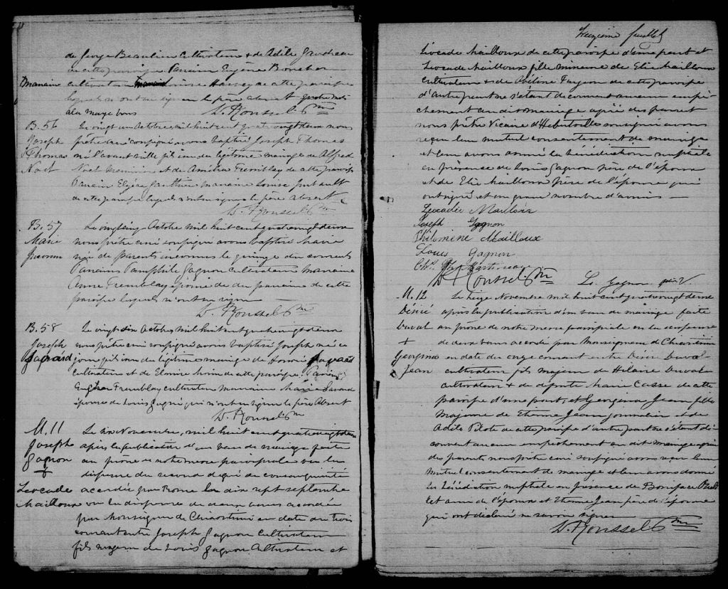 - Cette série regroupe les registres originaux de l'état civil, lesquels contiennent les enregistrements de baptêmes, de mariages et de sépultures consignés par le curé ou son représentant au cours de la période concernée par les documents. Pour la période 1860 à 1876 nous disposons également d'une copie sur bobines de microfilm, des registres conservés dans les paroisses. De plus, sur ces mêmes bobines sont inclus les registres de confirmations pour les années 1868 et 1874.Outre les renseignements à caractère généalogique que nous pouvons y puiser, cette série peut constituer une source documentaire importante pour toute étude-statistique ou comparative sur les conditions de vie à différentes époques (mortalité infantile, espérance de vie) ou pour toute recherche portant sur l'occupation des terres (lieu de résidence), sur le mode vie (métiers et professions, statut et âge des époux), sur les classes sociales (titres des parties impliquées, témoins/amis/parents présents lors du mariage), sur des événements spéciaux (quelques mentions dans les sépultures) et sur des sujets à incidence médicale tels les maladies héréditaires (cause du décès)