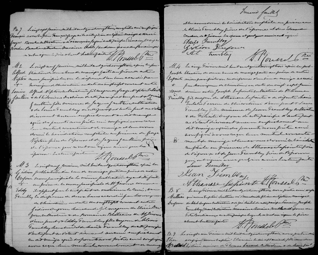 - Cette série regroupe les registres originaux de l'état civil, lesquels contiennent les enregistrements de baptêmes, de mariages et de sépultures consignés par le curé ou son représentant au cours de la période concernée par les documents. Pour la période 1860 à 1876 nous disposons également d'une copie sur bobines de microfilm, des registres conservés dans les paroisses. De plus, sur ces mêmes bobines sont inclus les registres de confirmations pour les années 1868 et 1874.Outre les renseignements à caractère généalogique que nous pouvons y puiser, cette série peut constituer une source documentaire importante pour toute étude-statistique ou comparative sur les conditions de vie à différentes époques (mortalité infantile, espérance de vie) ou pour toute recherche portant sur l'occupation des terres (lieu de résidence), sur le mode vie (métiers et professions, statut et âge des époux), sur les classes sociales (titres des parties impliquées, témoins/amis/parents présents lors du mariage), sur des événements spéciaux (quelques mentions dans les sépultures) et sur des sujets à incidence médicale tels les maladies héréditaires (cause du décès)