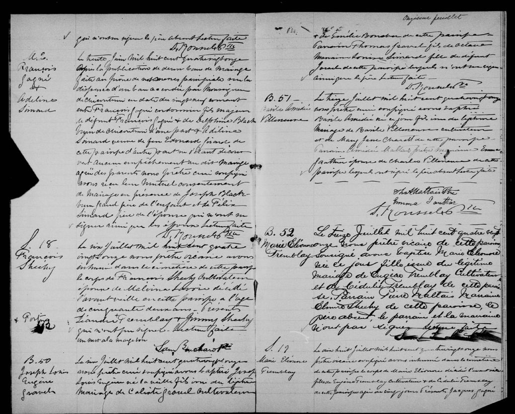 - Cette série regroupe les registres originaux de l'état civil, lesquels contiennent les enregistrements de baptêmes, de mariages et de sépultures consignés par le curé ou son représentant au cours de la période concernée par les documents. Pour la période 1860 à 1876 nous disposons également d'une copie sur bobines de microfilm, des registres conservés dans les paroisses. De plus, sur ces mêmes bobines sont inclus les registres de confirmations pour les années 1868 et 1874.Outre les renseignements à caractère généalogique que nous pouvons y puiser, cette série peut constituer une source documentaire importante pour toute étude-statistique ou comparative sur les conditions de vie à différentes époques (mortalité infantile, espérance de vie) ou pour toute recherche portant sur l'occupation des terres (lieu de résidence), sur le mode vie (métiers et professions, statut et âge des époux), sur les classes sociales (titres des parties impliquées, témoins/amis/parents présents lors du mariage), sur des événements spéciaux (quelques mentions dans les sépultures) et sur des sujets à incidence médicale tels les maladies héréditaires (cause du décès)