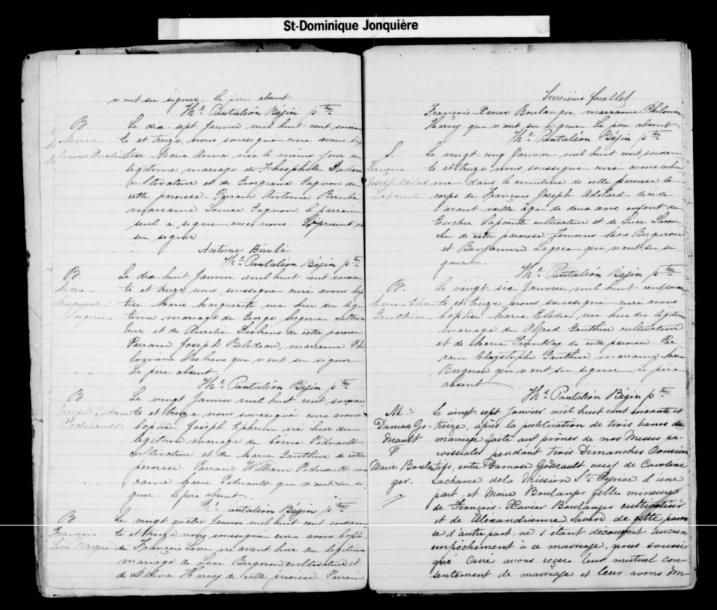 - Cette série regroupe les registres originaux de l'état civil, lesquels contiennent les enregistrements de baptêmes, de mariages et de sépultures consignés par le curé ou son représentant au cours de la période concernée par les documents. Pour la période 1866 à 1876 nous disposons également d'une copie sur bobines de microfilm, des registres conservés dans les paroisses.Outre les renseignements à caractère généalogique que nous pouvons y puiser, cette série peut constituer une source documentaire importante pour toute étude-statistique ou comparative sur les conditions de vie à différentes époques (mortalité infantile, espérance de vie) ou pour toute recherche portant sur l'occupation des terres (lieu de résidence), sur le mode vie (métiers et professions, statut et âge des époux), sur les classes sociales (titres des parties impliquées, témoins/amis/parents présents lors du mariage), sur des événements spéciaux (quelques mentions dans les sépultures) et sur des sujets à incidence médicale tels les maladies héréditaires (cause du décès)