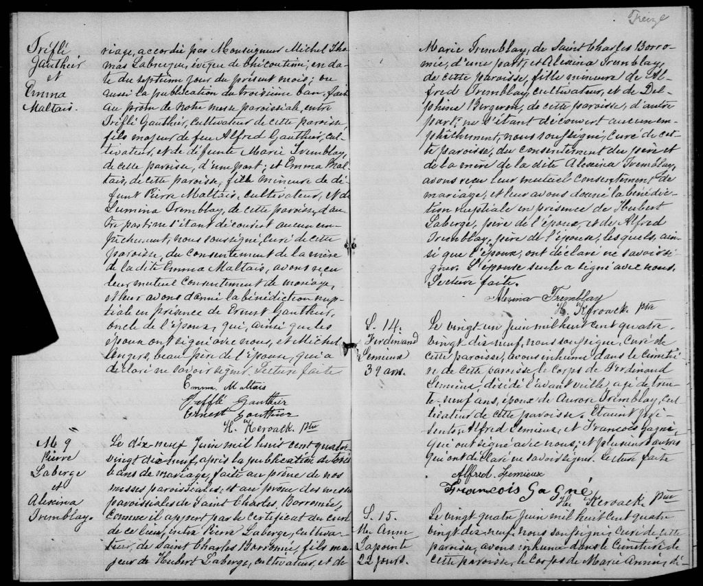 - Cette série regroupe les registres originaux de l'état civil, lesquels contiennent les enregistrements de baptêmes, de mariages et de sépultures consignés par le curé ou son représentant au cours de la période concernée par les documents. Pour la période 1866 à 1876 nous disposons également d'une copie sur bobines de microfilm, des registres conservés dans les paroisses.Outre les renseignements à caractère généalogique que nous pouvons y puiser, cette série peut constituer une source documentaire importante pour toute étude-statistique ou comparative sur les conditions de vie à différentes époques (mortalité infantile, espérance de vie) ou pour toute recherche portant sur l'occupation des terres (lieu de résidence), sur le mode vie (métiers et professions, statut et âge des époux), sur les classes sociales (titres des parties impliquées, témoins/amis/parents présents lors du mariage), sur des événements spéciaux (quelques mentions dans les sépultures) et sur des sujets à incidence médicale tels les maladies héréditaires (cause du décès)