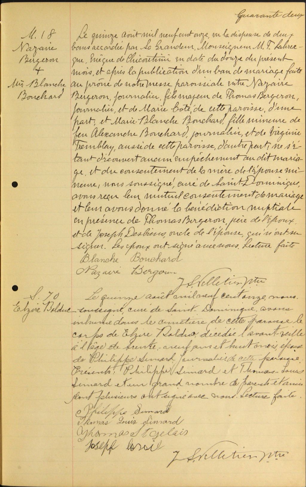 - Cette série regroupe les registres originaux de l'état civil, lesquels contiennent les enregistrements de baptêmes, de mariages et de sépultures consignés par le curé ou son représentant au cours de la période concernée par les documents. Pour la période 1866 à 1876 nous disposons également d'une copie sur bobines de microfilm, des registres conservés dans les paroisses.Outre les renseignements à caractère généalogique que nous pouvons y puiser, cette série peut constituer une source documentaire importante pour toute étude-statistique ou comparative sur les conditions de vie à différentes époques (mortalité infantile, espérance de vie) ou pour toute recherche portant sur l'occupation des terres (lieu de résidence), sur le mode vie (métiers et professions, statut et âge des époux), sur les classes sociales (titres des parties impliquées, témoins/amis/parents présents lors du mariage), sur des événements spéciaux (quelques mentions dans les sépultures) et sur des sujets à incidence médicale tels les maladies héréditaires (cause du décès)