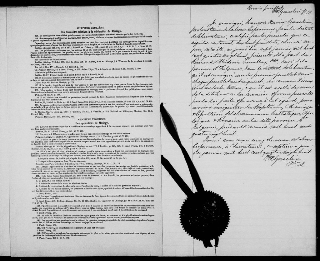 Cette série regroupe les registres originaux de l'état civil, lesquels contiennent les enregistrements de baptêmes, de mariages et de sépultures consignés par le curé ou son représentant au cours de la période concernée par les documents. Pour la période 1871 à 1876 nous disposons également d'une copie sur bobines de microfilm, des registres conservés dans les paroisses.Outre les renseignements à caractère généalogique que nous pouvons y puiser, cette série peut constituer une source documentaire importante pour toute étude-statistique ou comparative sur les conditions de vie à différentes époques (mortalité infantile, espérance de vie) ou pour toute recherche portant sur l'occupation des terres (lieu de résidence), sur le mode vie (métiers et professions, statut et âge des époux), sur les classes sociales (titres des parties impliquées, témoins/amis/parents présents lors du mariage), sur des événements spéciaux (quelques mentions dans les sépultures) et sur des sujets à incidence médicale tels les maladies héréditaires (cause du décès)