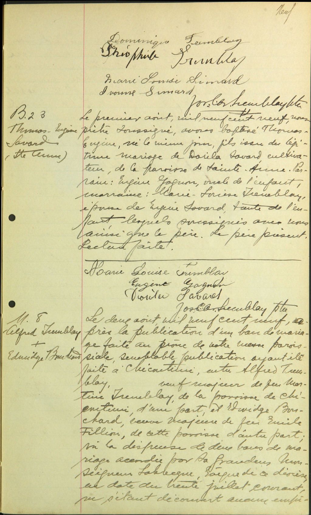 - Cette série regroupe les registres originaux de l'état civil, lesquels contiennent les enregistrements de baptêmes, de mariages et de sépultures consignés par le curé ou son représentant au cours de la période concernée par les documents. Pour la période 1871 à 1876 nous disposons également d'une copie sur bobines de microfilm, des registres conservés dans les paroisses.Outre les renseignements à caractère généalogique que nous pouvons y puiser, cette série peut constituer une source documentaire importante pour toute étude-statistique ou comparative sur les conditions de vie à différentes époques (mortalité infantile, espérance de vie) ou pour toute recherche portant sur l'occupation des terres (lieu de résidence), sur le mode vie (métiers et professions, statut et âge des époux), sur les classes sociales (titres des parties impliquées, témoins/amis/parents présents lors du mariage), sur des événements spéciaux (quelques mentions dans les sépultures) et sur des sujets à incidence médicale tels les maladies héréditaires (cause du décès)