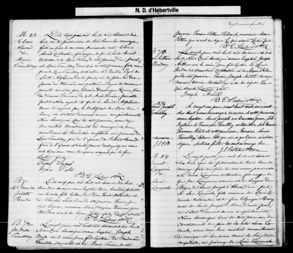 - Cette série regroupe les registres originaux de l'état civil, lesquels contiennent les enregistrements de baptêmes, de mariages et de sépultures consignés par le curé ou son représentant au cours de la période concernée par les documents.Outre les renseignements à caractère généalogique que nous pouvons y puiser, cette série peut constituer une source documentaire importante pour toute étude-statistique ou comparative sur les conditions de vie à différentes époques (mortalité infantile, espérance de vie) ou pour toute recherche portant sur l'occupation des terres (lieu de résidence), sur le mode vie (métiers et professions, statut et âge des époux), sur les classes sociales (titres des parties impliquées, témoins/amis/parents présents lors du mariage), sur des événements spéciaux (quelques mentions dans les sépultures) et sur des sujets à incidence médicale tels les maladies héréditaires (cause du décès)