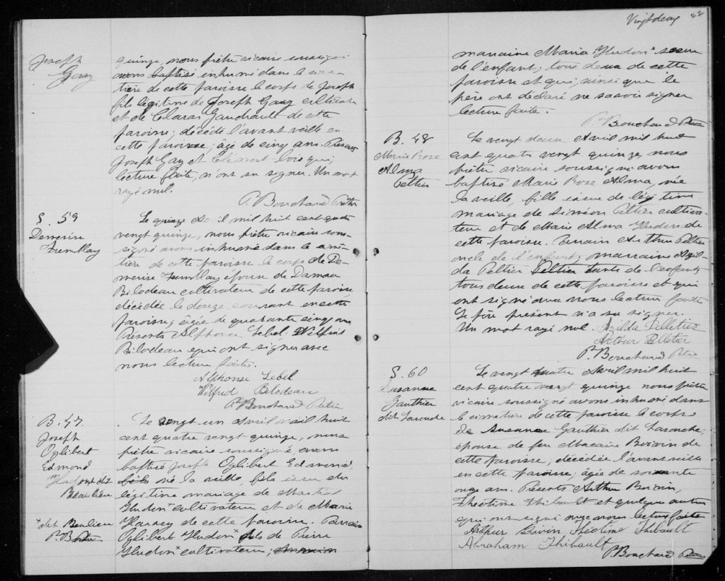 - Cette série regroupe les registres originaux de l'état civil, lesquels contiennent les enregistrements de baptêmes, de mariages et de sépultures consignés par le curé ou son représentant au cours de la période concernée par les documents.Outre les renseignements à caractère généalogique que nous pouvons y puiser, cette série peut constituer une source documentaire importante pour toute étude-statistique ou comparative sur les conditions de vie à différentes époques (mortalité infantile, espérance de vie) ou pour toute recherche portant sur l'occupation des terres (lieu de résidence), sur le mode vie (métiers et professions, statut et âge des époux), sur les classes sociales (titres des parties impliquées, témoins/amis/parents présents lors du mariage), sur des événements spéciaux (quelques mentions dans les sépultures) et sur des sujets à incidence médicale tels les maladies héréditaires (cause du décès)