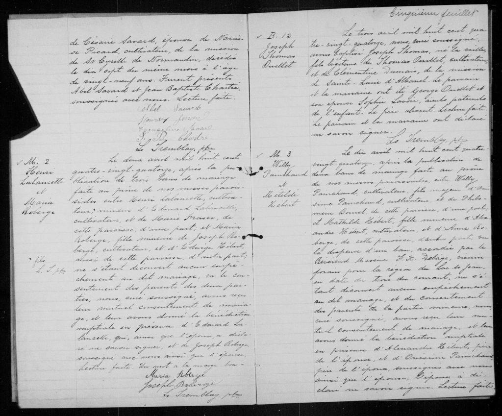 - Cette série regroupe les registres originaux de l'état civil, lesquels contiennent les enregistrements de baptêmes, de mariages et de sépultures consignés par le curé ou son représentant au cours de la période concernée par les documents.Outre les renseignements à caractère généalogique que nous pouvons y puiser, cette série peut constituer une source documentaire importante pour toute étude-statistique ou comparative sur les conditions de vie à différentes époques (mortalité infantile, espérance de vie) ou pour toute recherche portant sur l'occupation des terres (lieu de résidence), sur le mode vie (métiers et professions, statut et âge des époux), sur les classes sociales (titres des parties impliquées, témoins/amis/parents présents lors du mariage), sur des événements spéciaux (quelques mentions dans les sépultures) et sur des sujets à incidence médicale tels les maladies héréditaires (cause du décès)