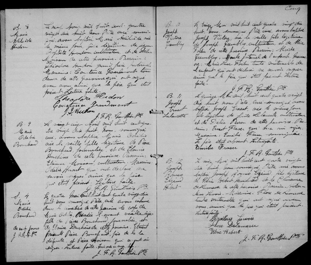 Cette série regroupe les registres originaux de l'état civil, lesquels contiennent les enregistrements de baptêmes, de mariages et de sépultures consignés par le curé ou son représentant au cours de la période concernée par les documents.Outre les renseignements à caractère généalogique que nous pouvons y puiser, cette série peut constituer une source documentaire importante pour toute étude-statistique ou comparative sur les conditions de vie à différentes époques (mortalité infantile, espérance de vie) ou pour toute recherche portant sur l'occupation des terres (lieu de résidence), sur le mode vie (métiers et professions, statut et âge des époux), sur les classes sociales (titres des parties impliquées, témoins/amis/parents présents lors du mariage), sur des événements spéciaux (quelques mentions dans les sépultures) et sur des sujets à incidence médicale tels les maladies héréditaires (cause du décès)