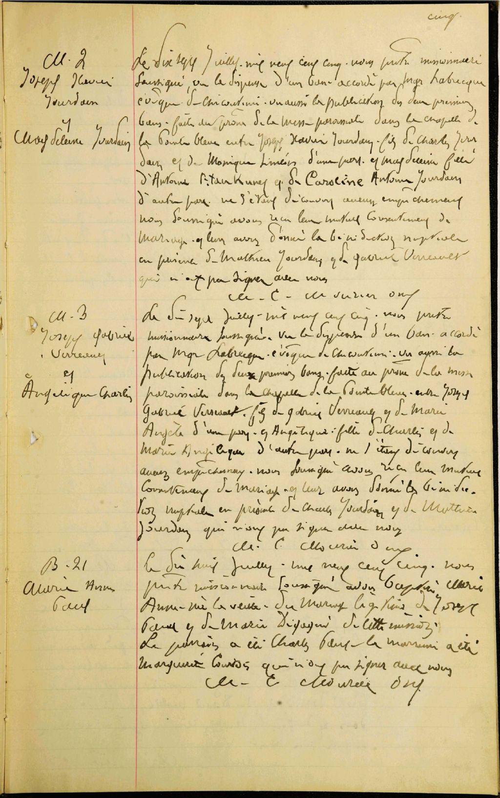Cette série regroupe les registres originaux de l'état civil, lesquels contiennent les enregistrements de baptêmes, de mariages et de sépultures consignés par le curé ou son représentant au cours de la période concernée par les documents.Outre les renseignements à caractère généalogique que nous pouvons y puiser, cette série peut constituer une source documentaire importante pour toute étude-statistique ou comparative sur les conditions de vie à différentes époques (mortalité infantile, espérance de vie) ou pour toute recherche portant sur l'occupation des terres (lieu de résidence), sur le mode vie (métiers et professions, statut et âge des époux), sur les classes sociales (titres des parties impliquées, témoins/amis/parents présents lors du mariage), sur des événements spéciaux (quelques mentions dans les sépultures) et sur des sujets à incidence médicale tels les maladies héréditaires (cause du décès)