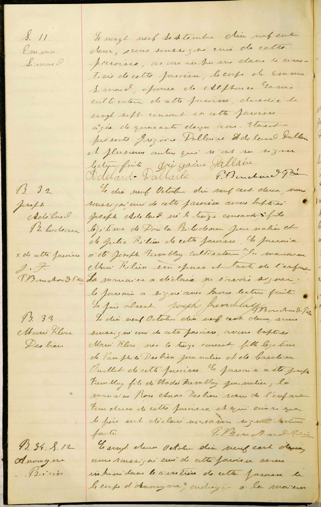 Cette série regroupe les registres originaux de l'état civil, lesquels contiennent les enregistrements de baptêmes, de mariages et de sépultures consignés par le curé ou son représentant au cours de la période concernée par les documents.Outre les renseignements à caractère généalogique que nous pouvons y puiser, cette série peut constituer une source documentaire importante pour toute étude-statistique ou comparative sur les conditions de vie à différentes époques (mortalité infantile, espérance de vie) ou pour toute recherche portant sur l'occupation des terres (lieu de résidence), sur le mode vie (métiers et professions, statut et âge des époux), sur les classes sociales (titres des parties impliquées, témoins/amis/parents présents lors du mariage), sur des événements spéciaux (quelques mentions dans les sépultures) et sur des sujets à incidence médicale tels les maladies héréditaires (cause du décès)