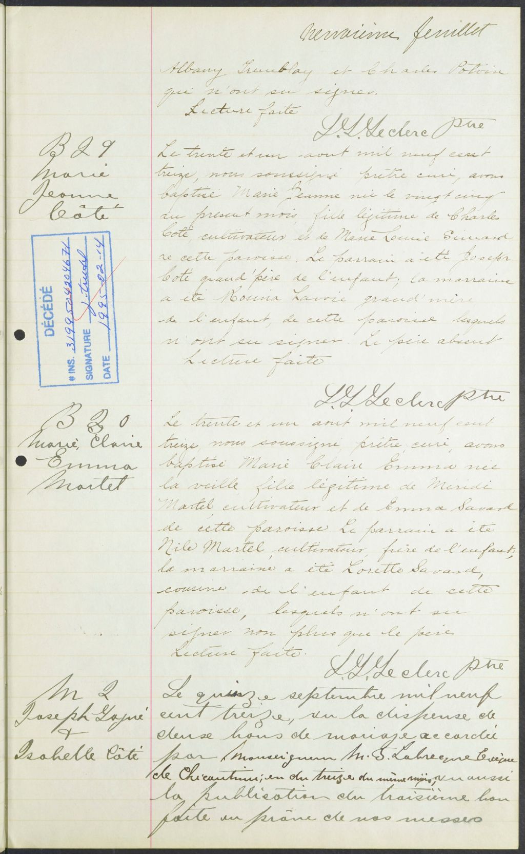 - Cette série regroupe les registres originaux de l'état civil, lesquels contiennent les enregistrements de baptêmes, de mariages et de sépultures consignés par le curé ou son représentant au cours de la période concernée par les documents.Outre les renseignements à caractère généalogique que nous pouvons y puiser, cette série peut constituer une source documentaire importante pour toute étude-statistique ou comparative sur les conditions de vie à différentes époques (mortalité infantile, espérance de vie) ou pour toute recherche portant sur l'occupation des terres (lieu de résidence), sur le mode vie (métiers et professions, statut et âge des époux), sur les classes sociales (titres des parties impliquées, témoins/amis/parents présents lors du mariage), sur des événements spéciaux (quelques mentions dans les sépultures) et sur des sujets à incidence médicale tels les maladies héréditaires (cause du décès)