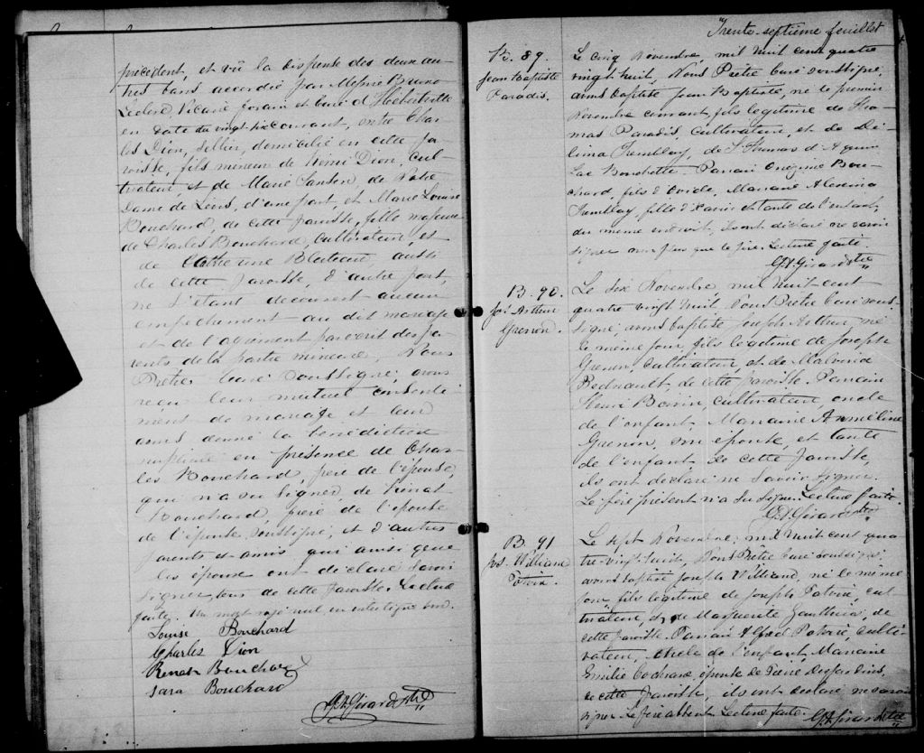 Cette série regroupe les registres originaux de l'état civil, lesquels contiennent les enregistrements de baptêmes, de mariages et de sépultures consignés par le curé ou son représentant au cours de la période concernée par les documents.Outre les renseignements à caractère généalogique que nous pouvons y puiser, cette série peut constituer une source documentaire importante pour toute étude-statistique ou comparative sur les conditions de vie à différentes époques (mortalité infantile, espérance de vie) ou pour toute recherche portant sur l'occupation des terres (lieu de résidence), sur le mode vie (métiers et professions, statut et âge des époux), sur les classes sociales (titres des parties impliquées, témoins/amis/parents présents lors du mariage), sur des événements spéciaux (quelques mentions dans les sépultures) et sur des sujets à incidence médicale tels les maladies héréditaires (cause du décès)