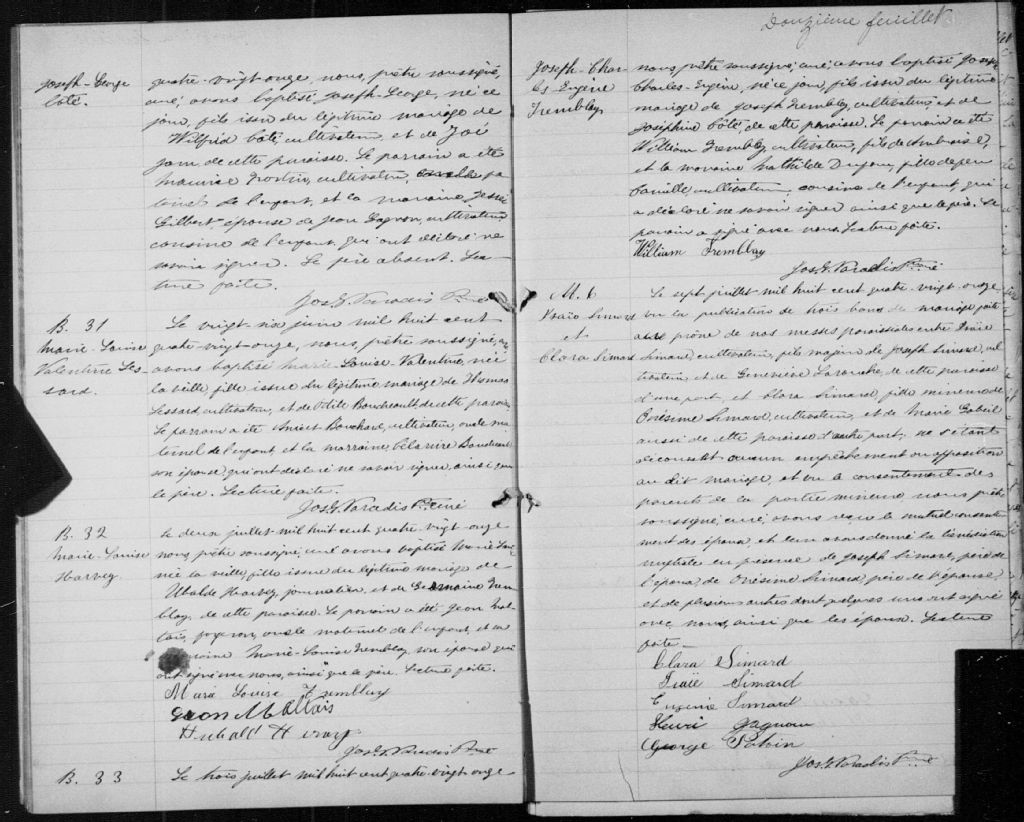 - Cette série regroupe les registres originaux de l'état civil, lesquels contiennent les enregistrements de baptêmes, de mariages et de sépultures consignés par le curé ou son représentant au cours de la période concernée par les documents.Outre les renseignements à caractère généalogique que nous pouvons y puiser, cette série peut constituer une source documentaire importante pour toute étude-statistique ou comparative sur les conditions de vie à différentes époques (mortalité infantile, espérance de vie) ou pour toute recherche portant sur l'occupation des terres (lieu de résidence), sur le mode vie (métiers et professions, statut et âge des époux), sur les classes sociales (titres des parties impliquées, témoins/amis/parents présents lors du mariage), sur des événements spéciaux (quelques mentions dans les sépultures) et sur des sujets à incidence médicale tels les maladies héréditaires (cause du décès)