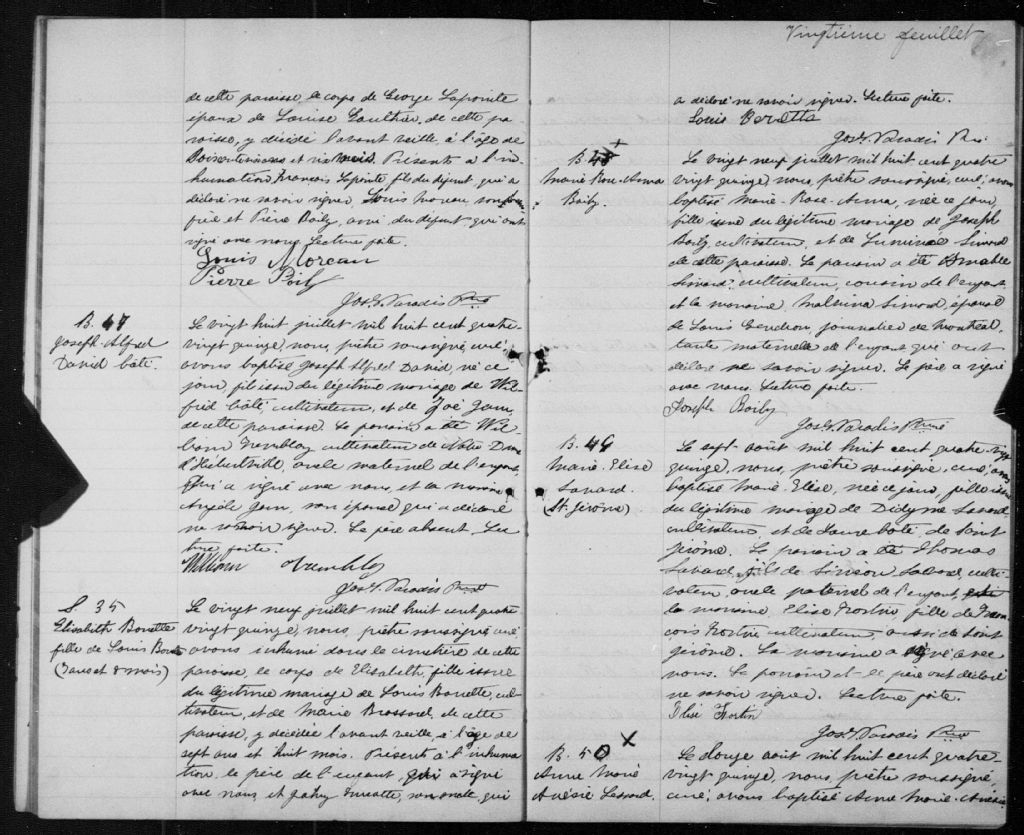 - Cette série regroupe les registres originaux de l'état civil, lesquels contiennent les enregistrements de baptêmes, de mariages et de sépultures consignés par le curé ou son représentant au cours de la période concernée par les documents.Outre les renseignements à caractère généalogique que nous pouvons y puiser, cette série peut constituer une source documentaire importante pour toute étude-statistique ou comparative sur les conditions de vie à différentes époques (mortalité infantile, espérance de vie) ou pour toute recherche portant sur l'occupation des terres (lieu de résidence), sur le mode vie (métiers et professions, statut et âge des époux), sur les classes sociales (titres des parties impliquées, témoins/amis/parents présents lors du mariage), sur des événements spéciaux (quelques mentions dans les sépultures) et sur des sujets à incidence médicale tels les maladies héréditaires (cause du décès)