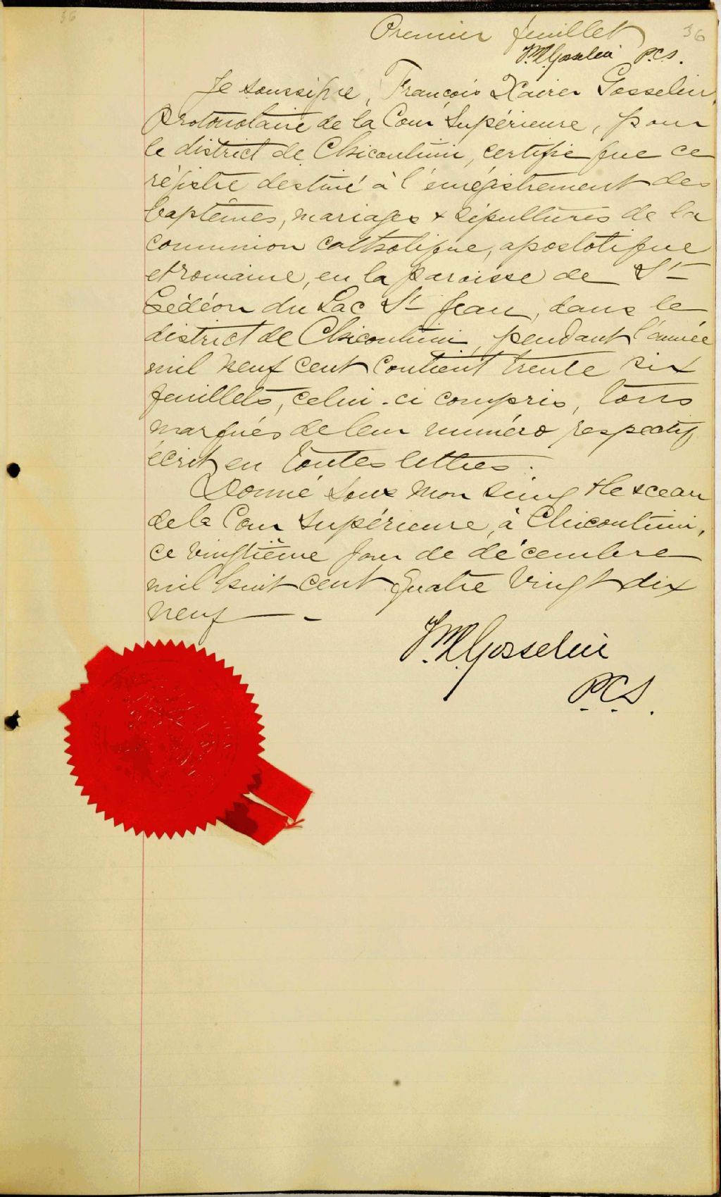 Saint-Gédéon, 1881-1922, Archives nationales à Saguenay, Fonds Cour supérieure. District judiciaire de Roberval. État civil, (02C,CE202,S6).
