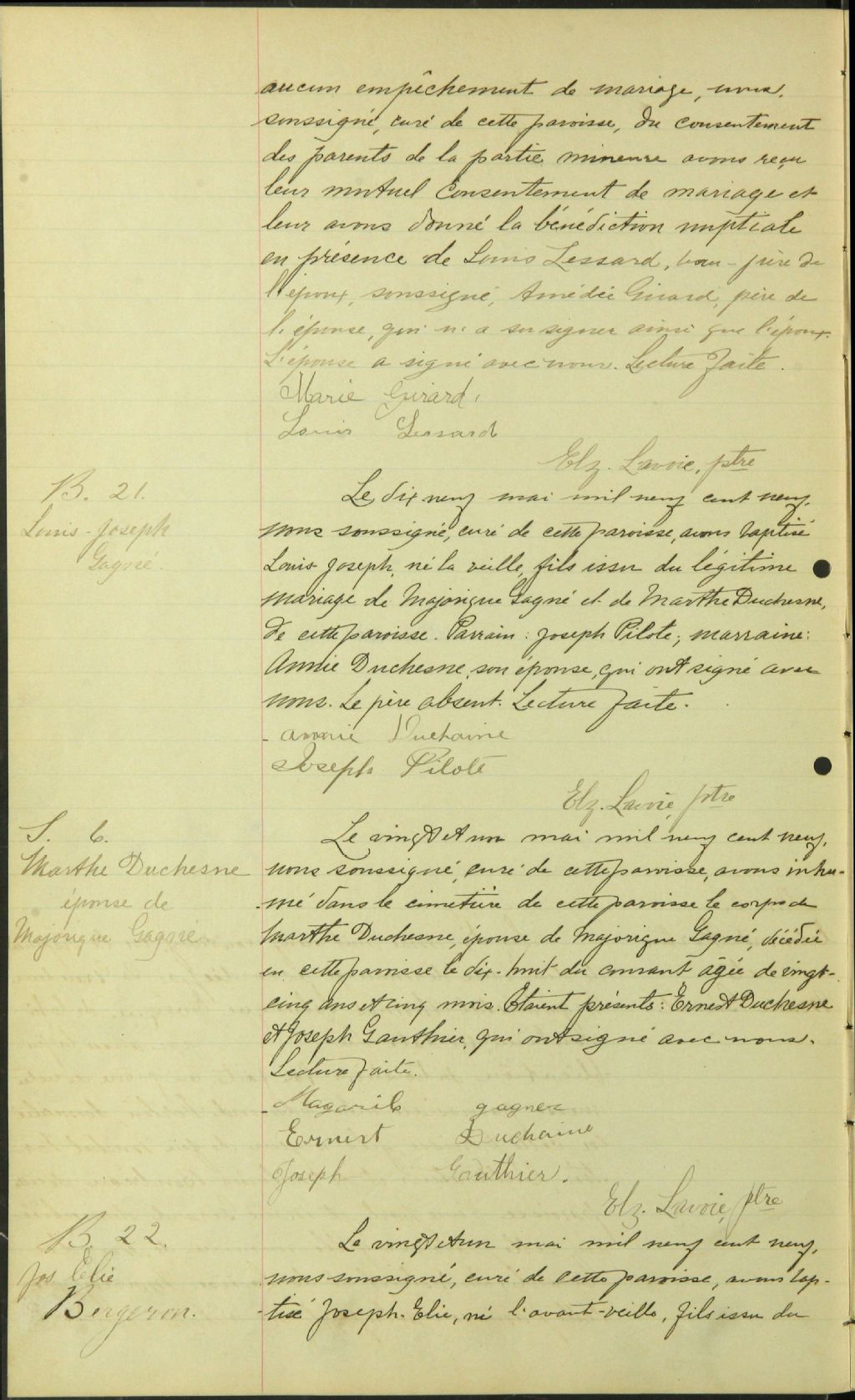 - Cette série regroupe les registres originaux de l'état civil, lesquels contiennent les enregistrements de baptêmes, de mariages et de sépultures consignés par le curé ou son représentant au cours de la période concernée par les documents.Outre les renseignements à caractère généalogique que nous pouvons y puiser, cette série peut constituer une source documentaire importante pour toute étude-statistique ou comparative sur les conditions de vie à différentes époques (mortalité infantile, espérance de vie) ou pour toute recherche portant sur l'occupation des terres (lieu de résidence), sur le mode vie (métiers et professions, statut et âge des époux), sur les classes sociales (titres des parties impliquées, témoins/amis/parents présents lors du mariage), sur des événements spéciaux (quelques mentions dans les sépultures) et sur des sujets à incidence médicale tels les maladies héréditaires (cause du décès)