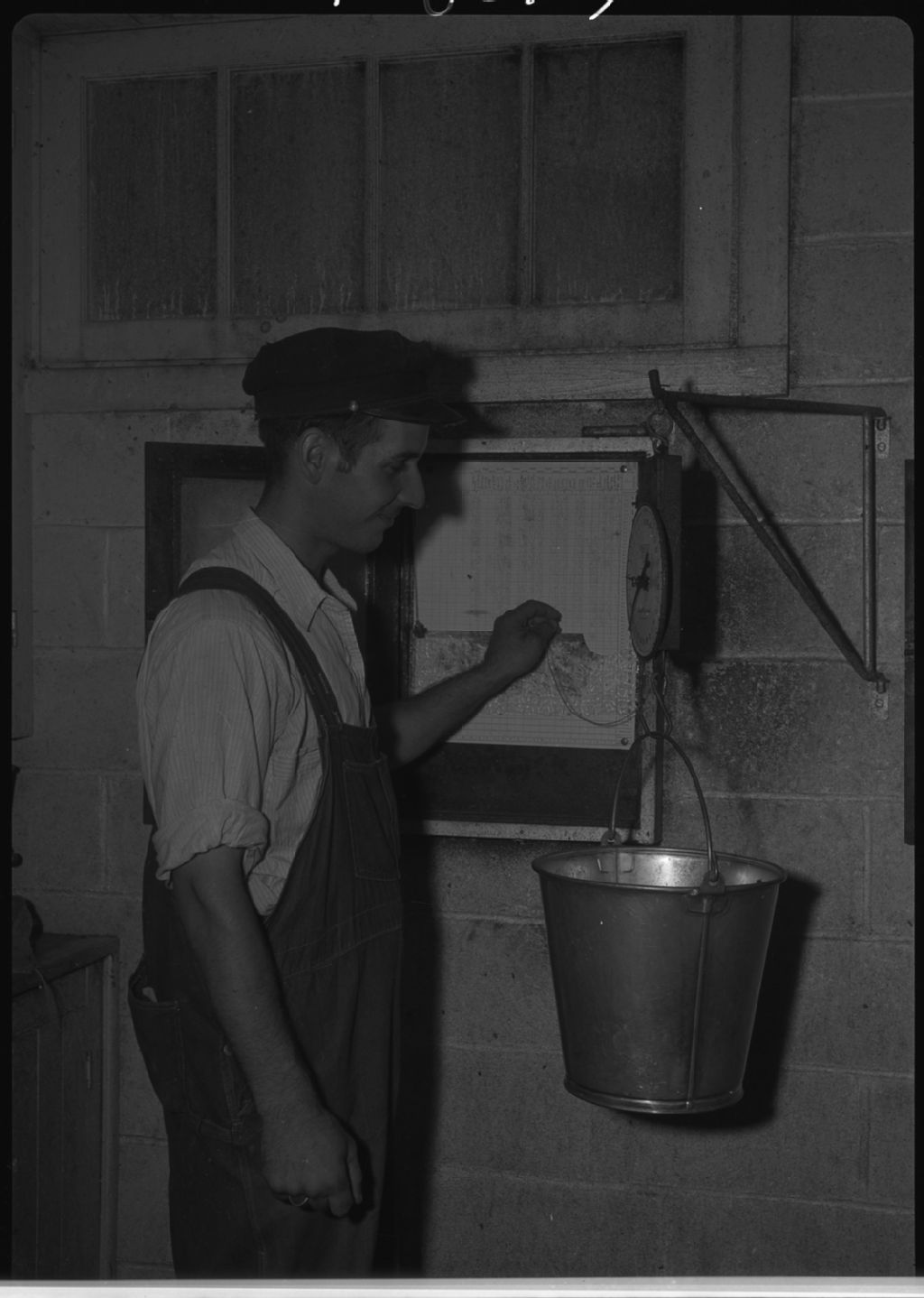 Pesé du lait lors du contrôle laitier. Laboratoire du ministère de l'Agriculture. Édifice D