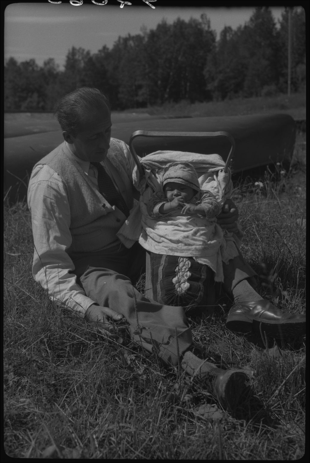 J.A. Tremblay et un papoose. Réserve indienne de Manouane, 1947, Archives nationales à Québec, Fonds Ministère de la Culture et des Communications, (03Q,E6,S7,SS1,D2,P92363), J. Armand Tremblay.
