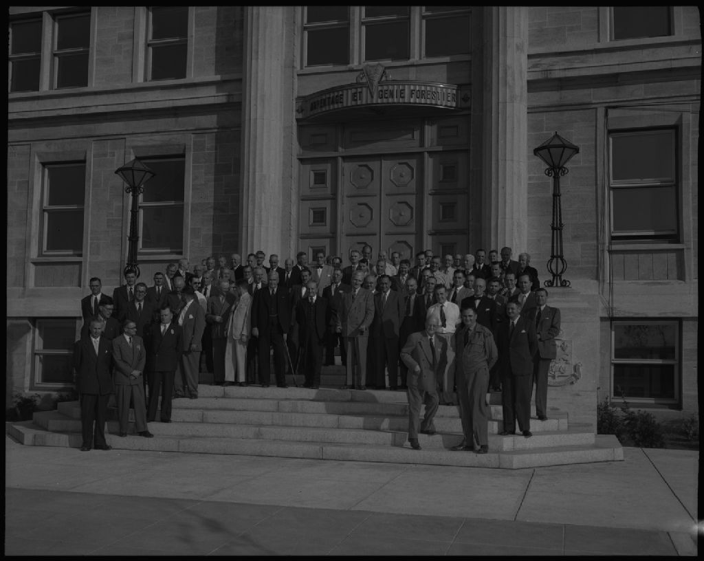 À l'occasion de la visite des délégués de la conférence sylvicole du Commonwealth britannique à Duchesnay, 1952, Archives nationales à Québec, Fonds Ministère de la Culture et des Communications, (03Q,E6,S7,SS1,D2,P92635), Neuville Bazin.