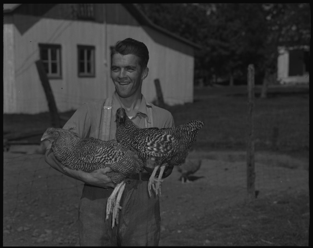Monsieur Égide Beaudoin, fils de Jos Beaudoin, lauréat de la médaille d'or du concours du Mérite agricole juvenile de 1952 dans la classe des non diplômés. Projet d'élevage aviculteur de Sainte-Hénédine