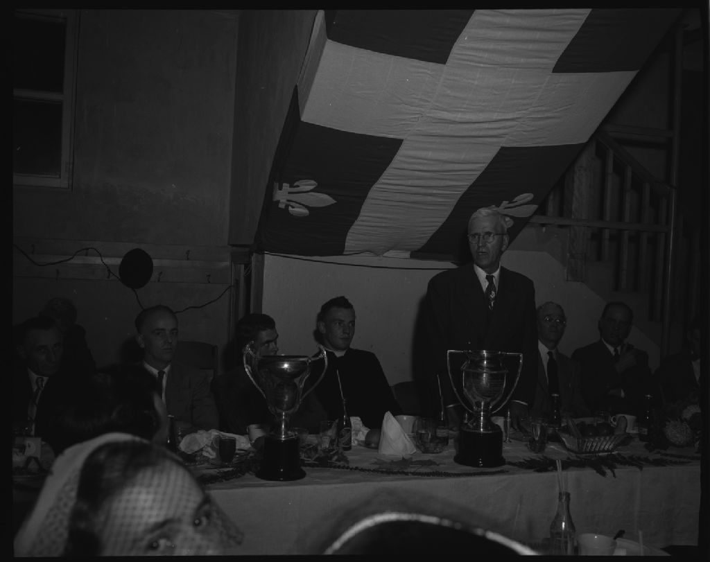 Banquet offert aux lauréats des jeunes du mérite agricole, Égide et Roch-Émile Beaudoin. Sainte-Hénédine., 1952, Archives nationales à Québec, Fonds Ministère de la Culture et des Communications, (03Q,E6,S7,SS1,D2,P93416), Omer Beaudoin.