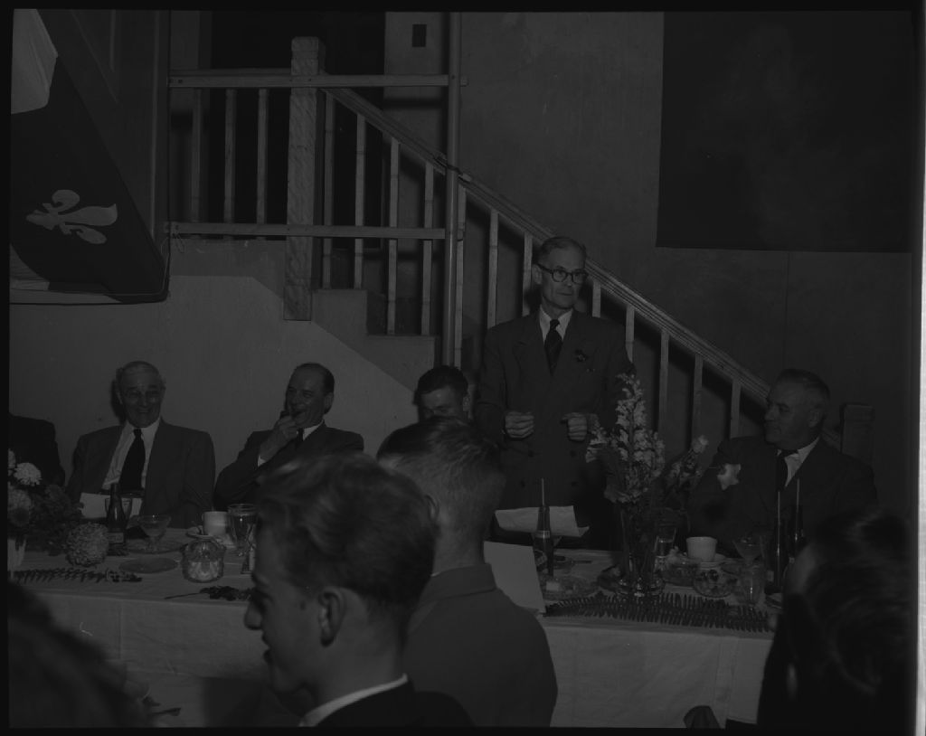 Banquet offert aux lauréats des jeunes du mérite agricole, Égide et Roch-Émile Beaudoin. Sainte-Hénédine., 1952, Archives nationales à Québec, Fonds Ministère de la Culture et des Communications, (03Q,E6,S7,SS1,D2,P93418), Omer Beaudoin.