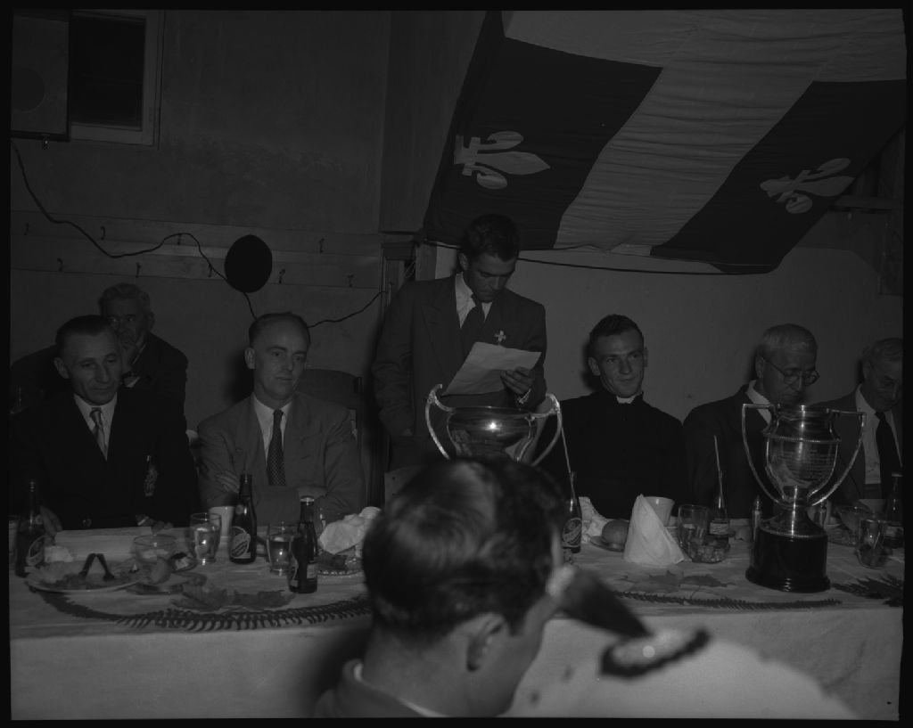 Banquet offert aux lauréats des jeunes du mérite agricole, Égide et Roch-Émile Beaudoin. Sainte-Hénédine., 1952, Archives nationales à Québec, Fonds Ministère de la Culture et des Communications, (03Q,E6,S7,SS1,D2,P93419), Omer Beaudoin.