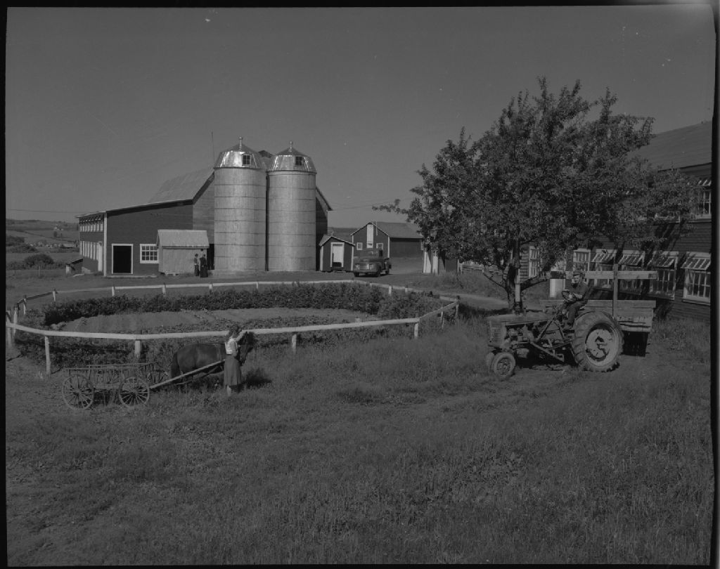 Grange et parterre chez Cyrille Blais. Lac Mégantic, comté Mégantic., 1952, Archives nationales à Québec, Fonds Ministère de la Culture et des Communications, (03Q,E6,S7,SS1,D2,P93809), Omer Beaudoin.