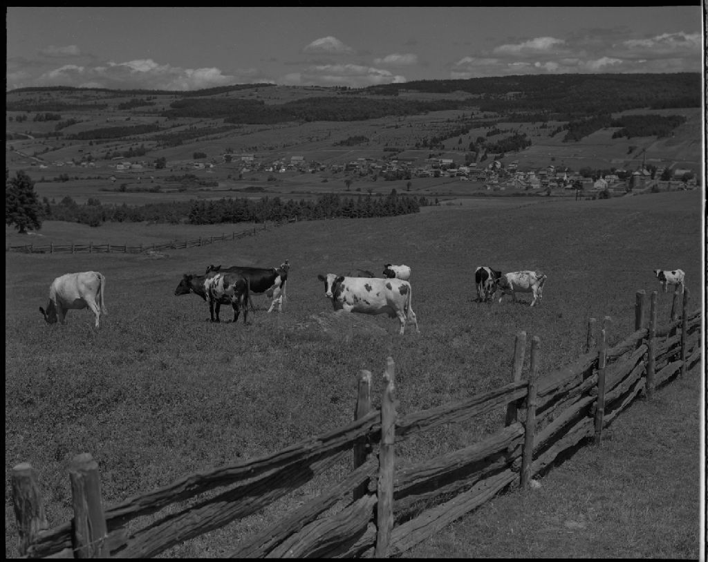 Troupeau (croisé) chez Philippe Bouffard et vue sur le village de Saint-Léon-de-Standon, comté Dorchester.